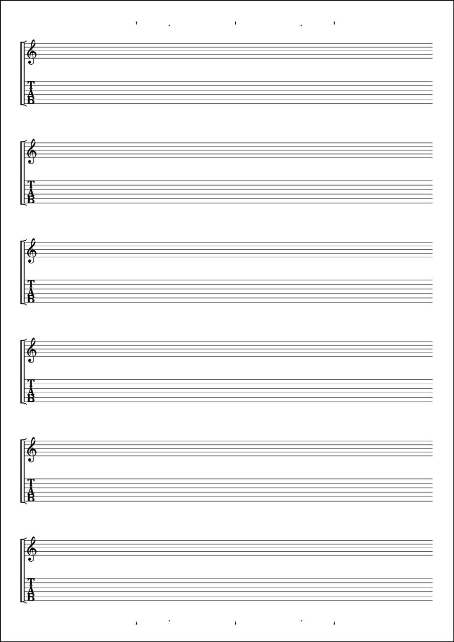 A4サイズのギターTABノート。5線(ト音記号)とTABの2段譜、小節線ガイド付き。