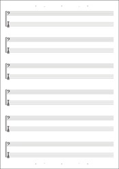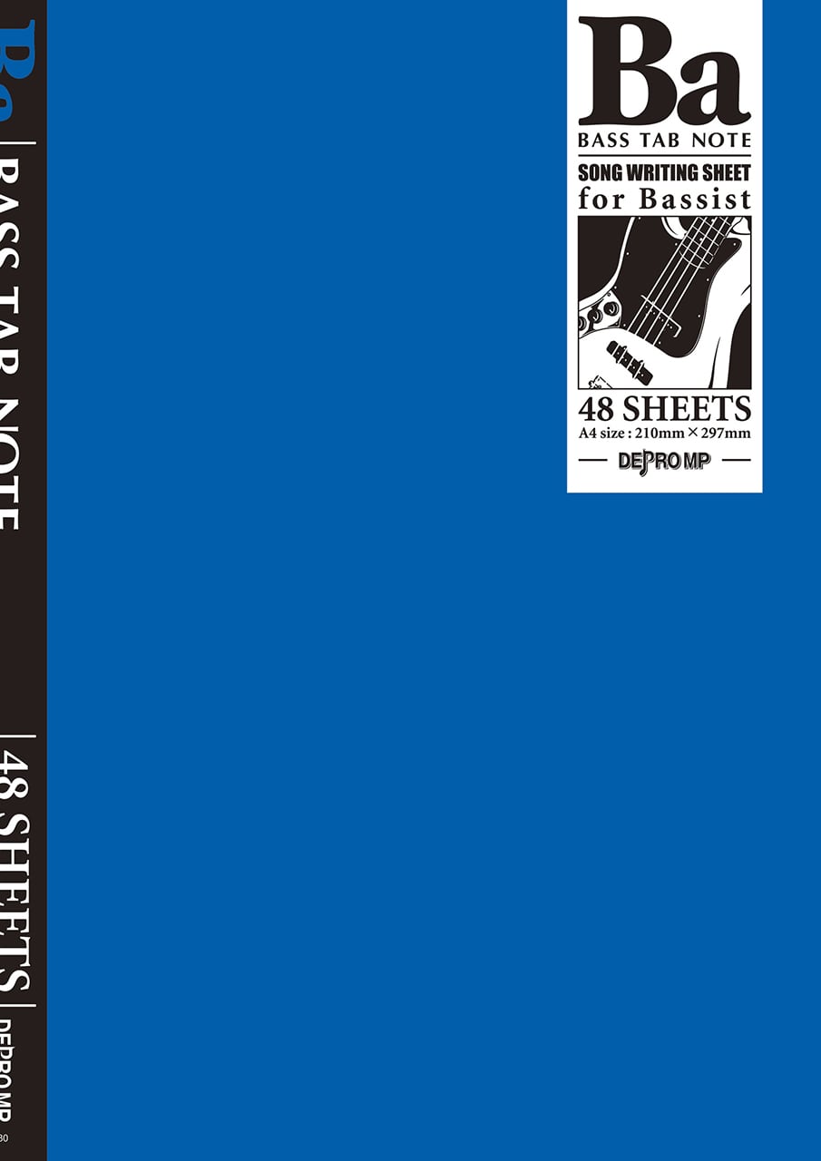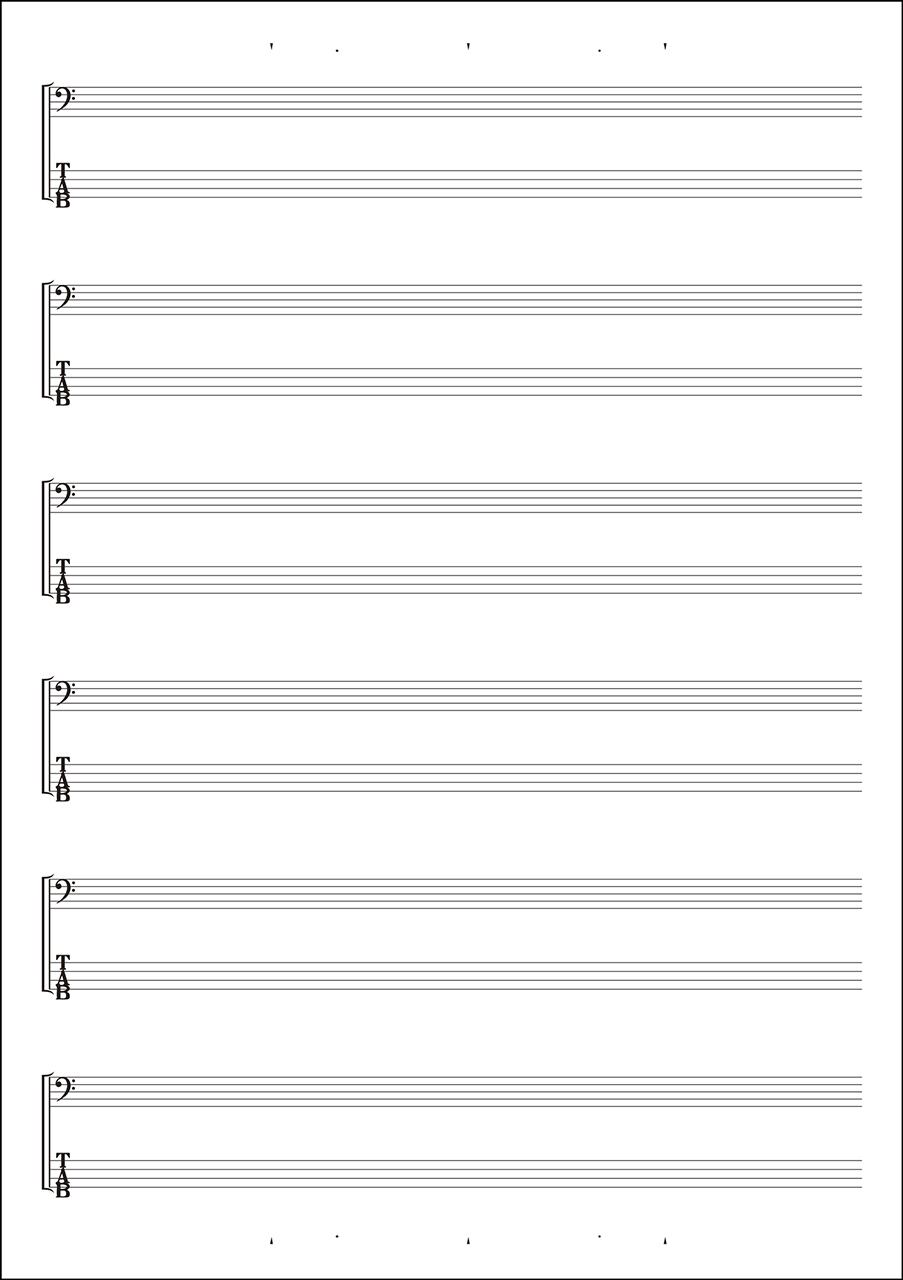 A4サイズのベースTABノート。5線(ヘ音記号)とTABの2段譜、小節線ガイド付き。