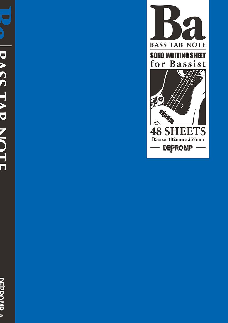 B5サイズのベースTABノート。5線(ヘ音記号)とTABの2段譜、小節線ガイド付き。