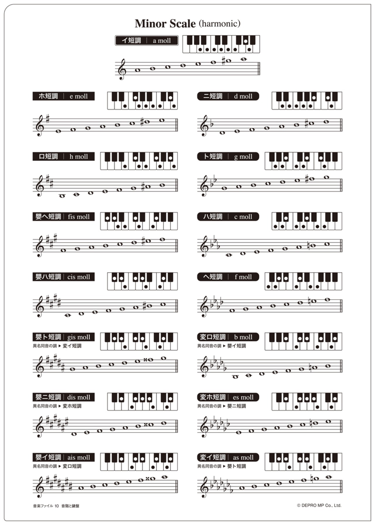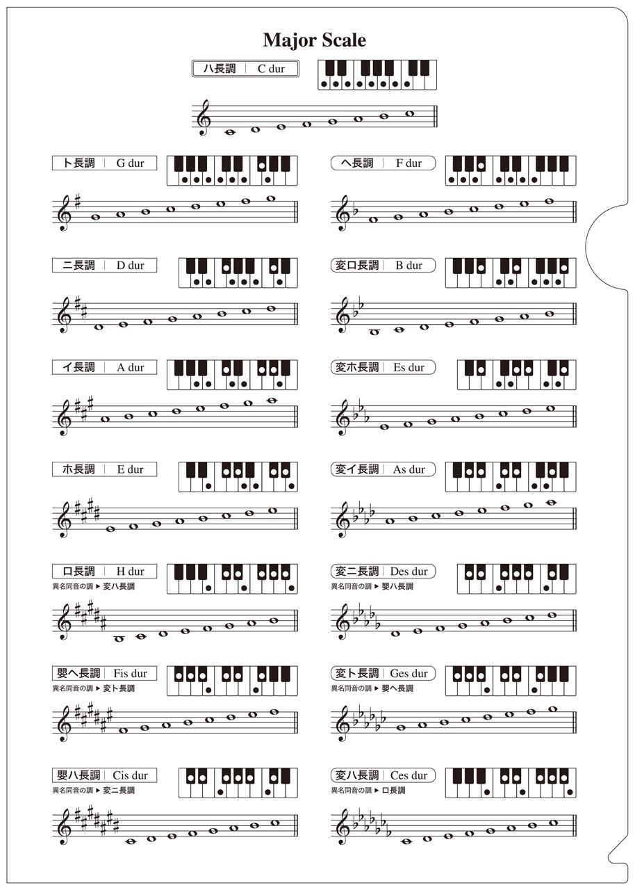 長調と短調(和声)の音階を五線と鍵盤で示したA4用のクリアフォルダーです。